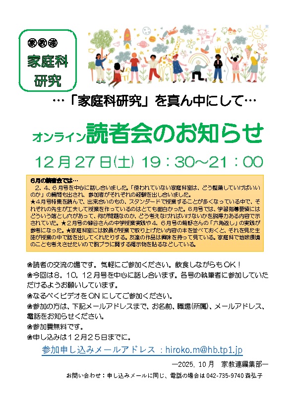 雑誌「家庭科研究」の読者会を実施します。12月27日(土) 19:30~21:00 気軽な会です。ぜひ、ご参加ください。今回は8,10,12月号を中心に話し合います。...